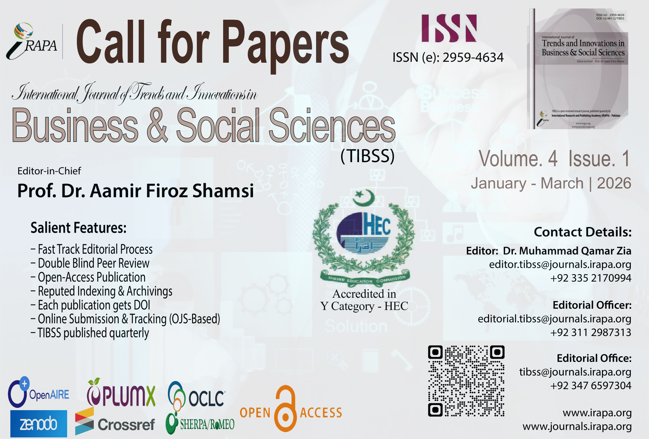 The International Journal of Trends and Innovations in Business & Social Sciences (TIBSS) is a double-blind peer-reviewed research Journal published quarterly by International Research and Publishing Academy (iRAPA). The journal adheres to a standard review board as per the policy of HEC. TIBSS tends to cover the new developments in theory and applications of business and entrepreneurship innovation strategies, methods and tools to enhance organisational competitiveness. Business innovation significantly contributes to the improvement in enterprise productivity and quality.