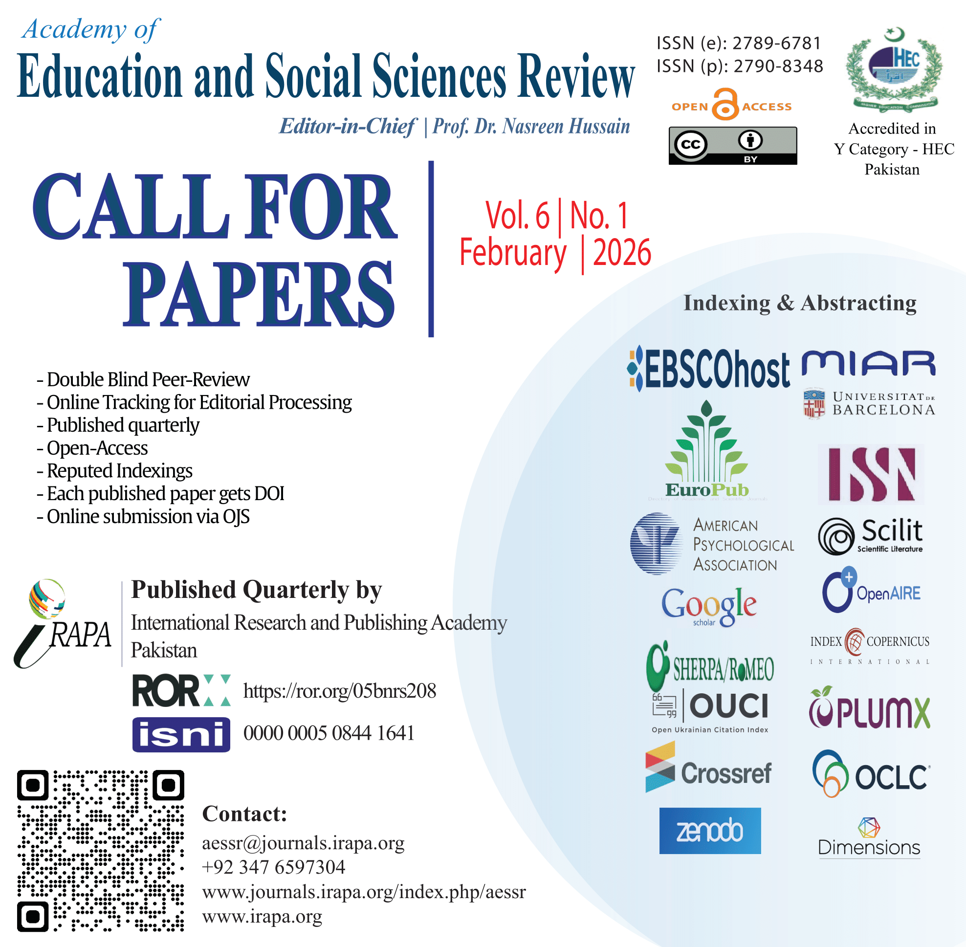 In line with the HEC notification, the upcoming release of AESSR (Vol 6, No 1 | 2026) will be accredited for HEC Recognized National Research Journals w.e.f. October 01, 2024 to December 31, 2025.